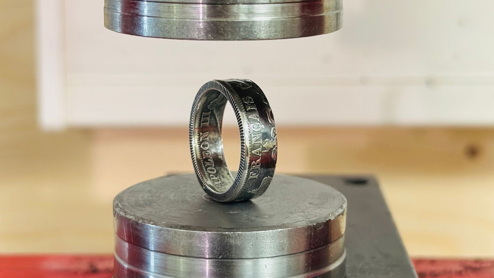 Inscription visible sur la tranche de la bague. Fabriquée à partir d'une pièce Napoléon III