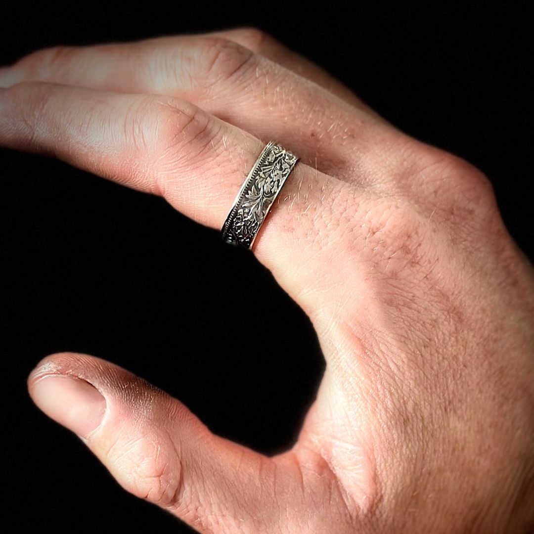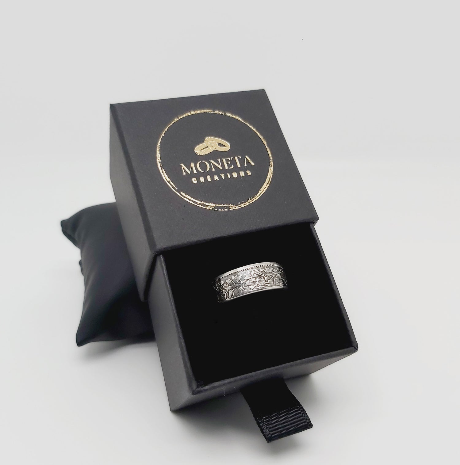 Argent 835‰ avec quelques grammes de cuivre augmentant la dureté et la longévité de la bague.