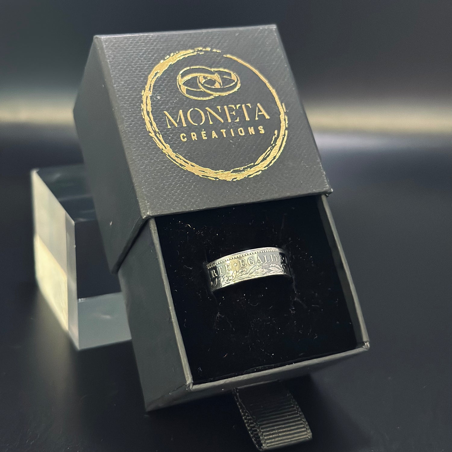 Cette pièce en argent a été frappée entre 1870 et 1895, elle représente la déesse Cérès (qui dans la mythologie romaine, était la déesse de l'agriculture et de la fécondité). Nous l'avons transformé en une bague unique qui rend hommage à la mythologie Romaine tout en arborant la devise Française.