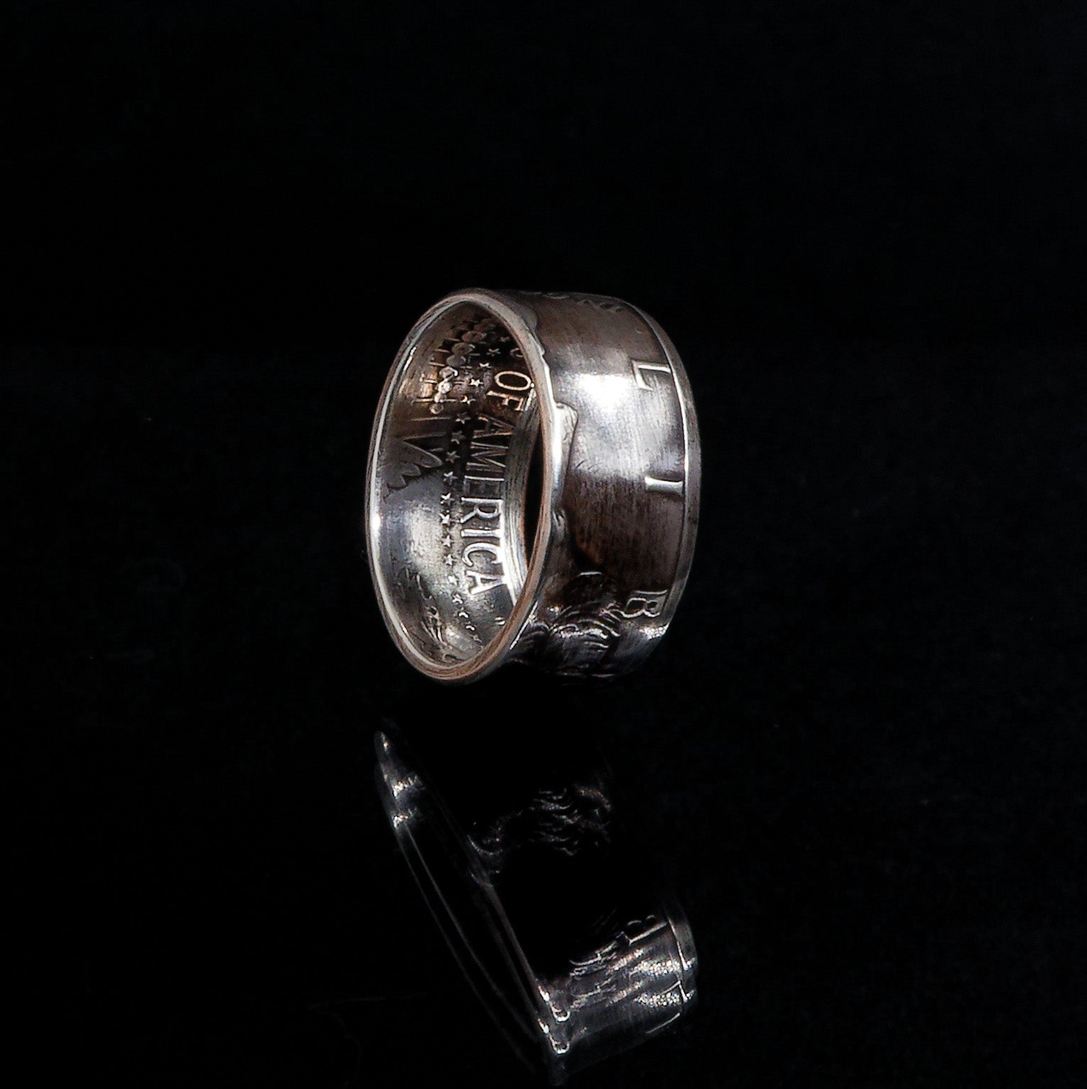 Bague en argent fabriquée à partir d'une pièce de Half Dollar Kennedy en argent.