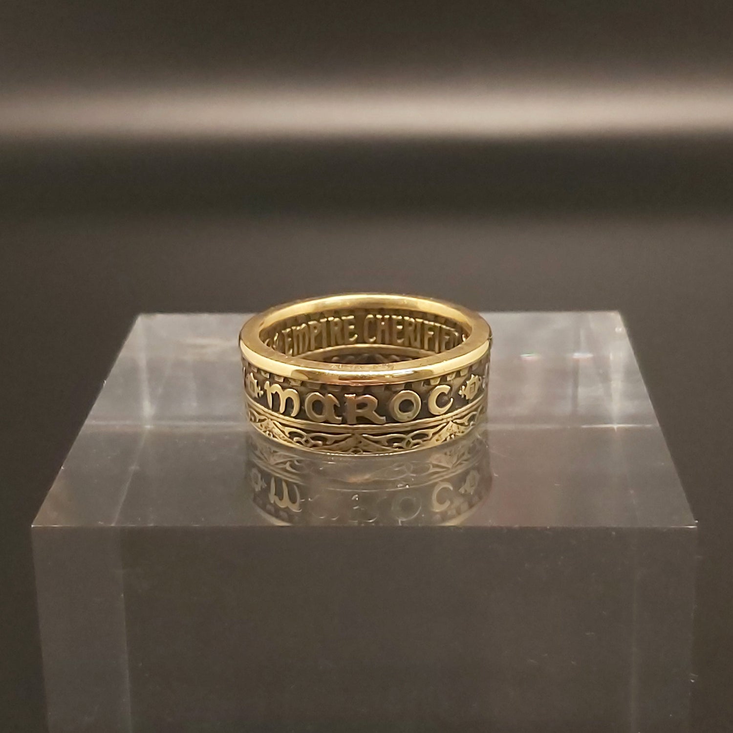 Une bague en hommage à l'empire Chérifien. Une inscription "Maroc" visible sur l'extérieur de la bague et "EMPIRE CHERIFIEN" à l'intérieur de la bague.