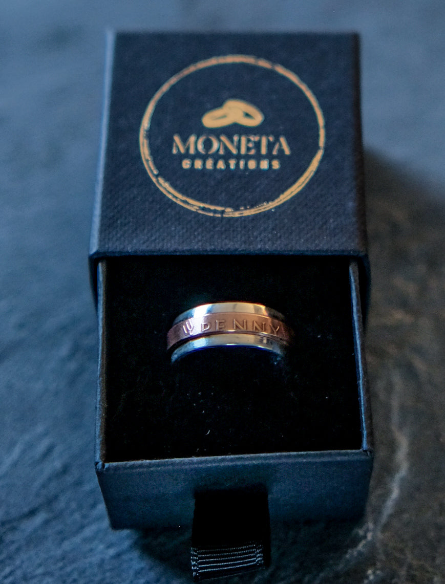 Une technique de fabrication de haute précision entièrement maîtrisée dans notre atelier, afin de créer cette alliance dynamique entre deux pièces de monnaie. Une chose est sûre, vous allez adorer jouer avec votre bague.