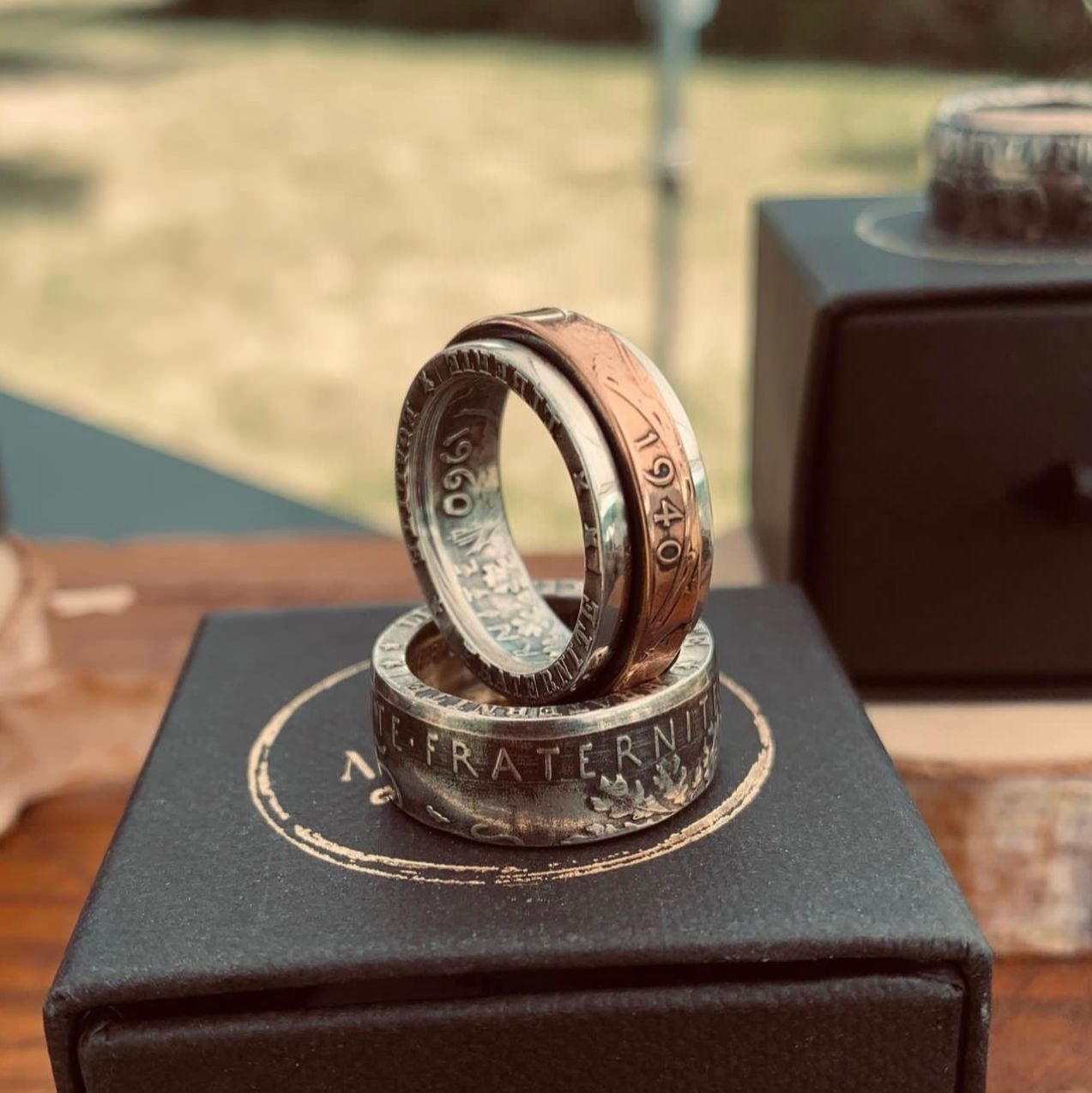 Deux pièces de monnaie viennent composter cette bague. L'anneau principale fait à partir d'une Semeuse en argent et l'anneau tournant fait avec une One Penny en cuivre.